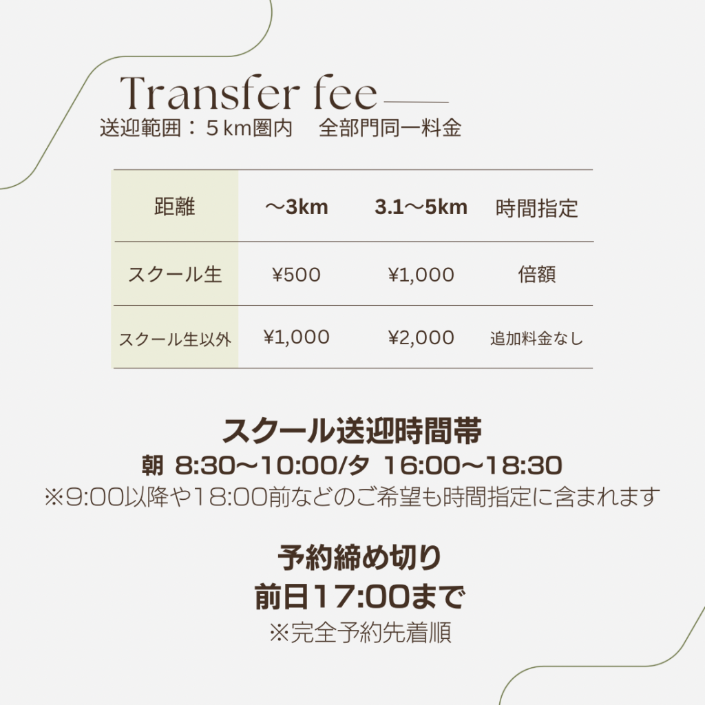 ※送迎ができず、やむを得ず当日のご予約自体をキャンセルされる場合は、送迎費キャンセル料+各サービスのキャンセルポリシーが適用となります。